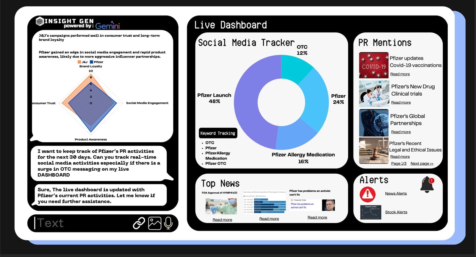 An AI-powered productivity tool that transforms fragmented, scattered data into actionable insights for marketing and PR professionals. Built with real-time dashboards, keyword tracking, and a multi-modal chatbot—designed to help teams stop drowning in data and start making decisions.